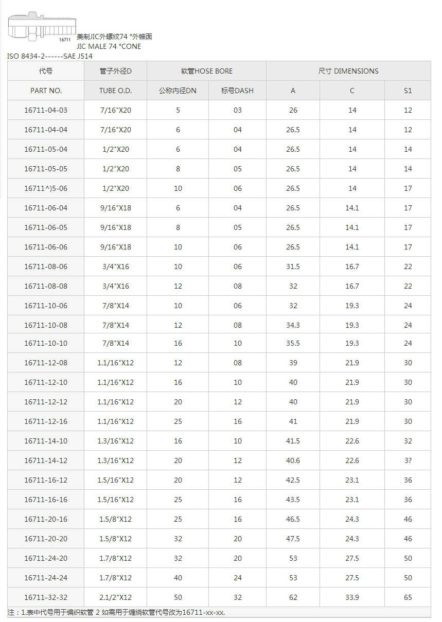 16711美制JIC外螺紋74°外錐面系列